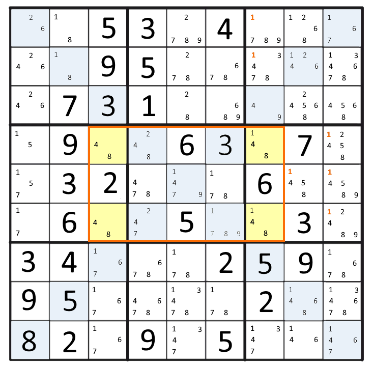 לדוגמה, אם שני תאים באלכסון מכילים את אותו מועמד, הם יוצרים מעין "זוג מצביע". תאים אלו נמצאים בקצוות מנוגדים של מלבן דמיוני. המשמעות היא שהתאים הנגדיים של מלבן זה אינם יכולים להכיל את אותו המועמד — זוהי דרך עוצמתית להסיר ספרות ולהאיץ את התהליך.